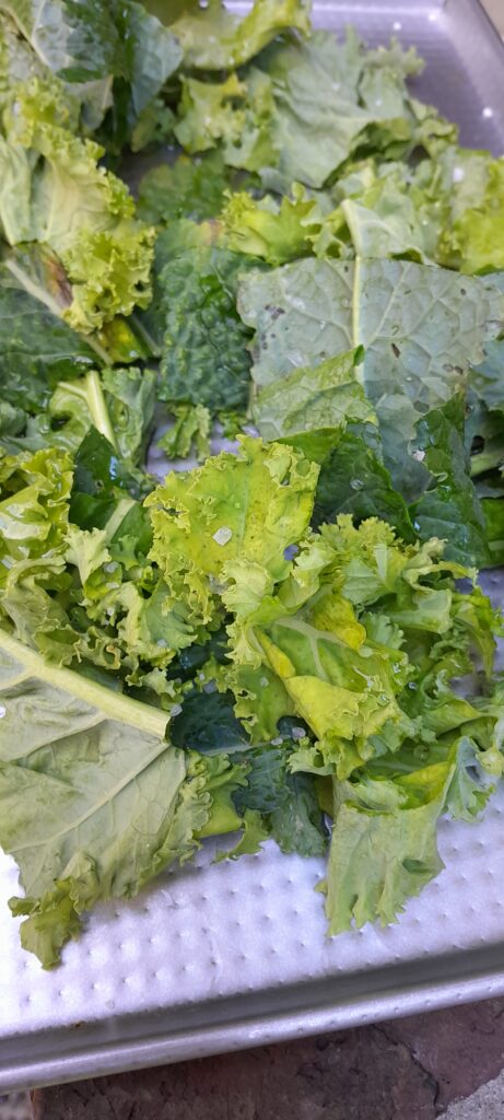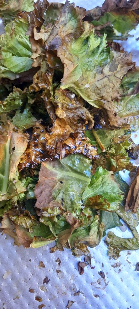 “Chips de Kale” (limpio, cortado en tiras, estuvo en una placa con “algo” de sal gruesa, horno pre calentado y al máximo. Cuando lo sentí crocante le puse un hilo de aceite de oliva, mezclé y esos chips de kale le vinieron bárbaros a guarniciones tibias)